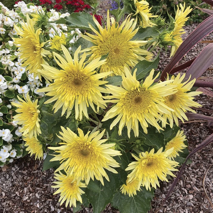 Compact and pollen-free. Branched plants produce an abundance of long-lasting 4″ double blooms in a bright shade of lemon yellow. Ideal for creating cheery sunflower hedges. Ht: 14-16″.